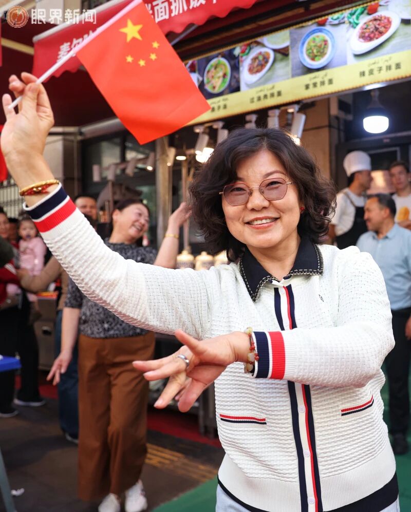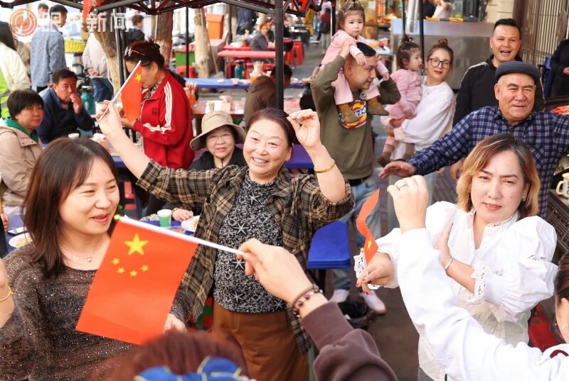 9月26日,沙依巴克区和田二街一片欢腾,商户、居民与游客汇聚街头,共同庆祝新疆维吾尔自治区成立70周年。现场歌声飞扬、舞步欢腾,洋溢着喜庆祥和的节日气氛。各族群众在欢声笑语中心手相连,绘出一幅团结和谐、生机盎然的美好画卷。时值国庆、中秋双节临近,这份喜悦更显温馨,为即将到来的双节平添了浓浓的团圆情与家国意。各族群众跳起欢快的舞蹈。记者迪丽娜尔·加力肯摄
