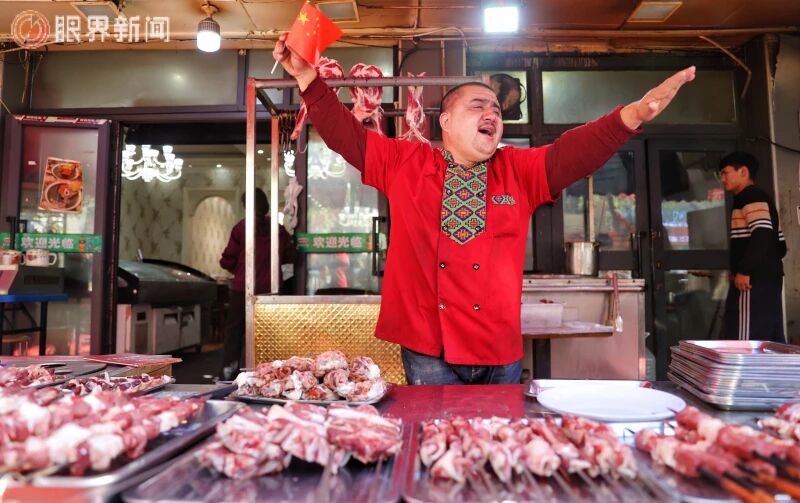9月26日,和田二街,一名商户欢快起舞。记者迪丽娜尔·加力肯摄