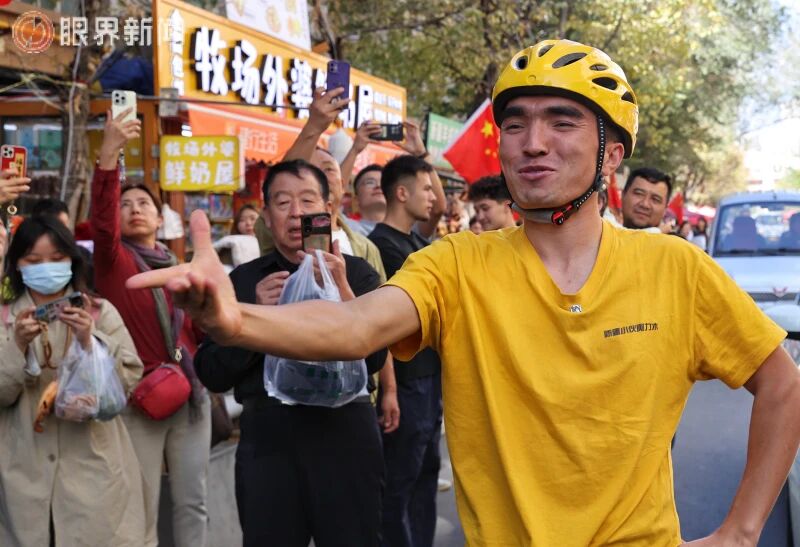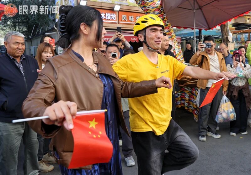 9月26日,和田二街,网络达人新疆小伙阿力木邀请现场群众加入舞蹈。记者迪丽娜尔·加力肯摄