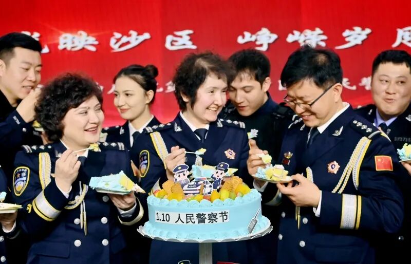 1月10日,退休民警与青年民警共享节日蛋糕。石榴云/新疆法治报记者单坤摄