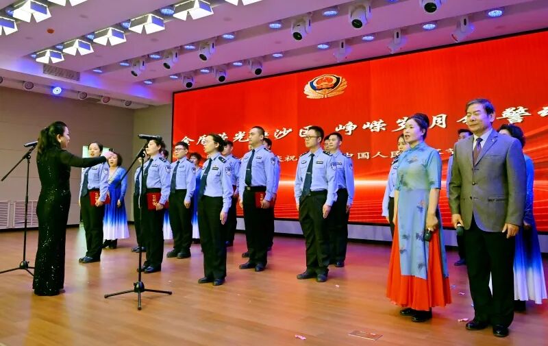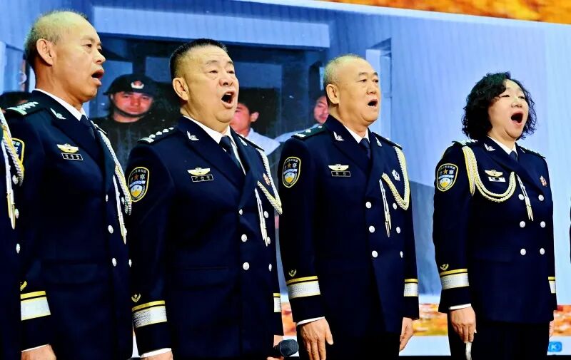 激昂豪迈的舞蹈《奋进新时代》为仪式启幕,舞者们跃动的身影挥洒出新时代人民警察奋进新征程的蓬勃朝气与昂扬斗志,瞬间点燃现场氛围。随后,退休老干部们精神矍铄地登上舞台,齐声高唱《人民警察警歌》,嘹亮的歌声让在场人员深受感染。