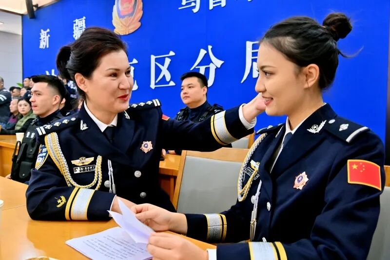 1月10日,乌市公安局沙区分局退休民警马依拉·夏尔甫丁(左)叮嘱徒弟艾尼菲然・艾尼瓦尔在以后的工作中一定要认真细心。石榴云/新疆法治报记者单坤摄