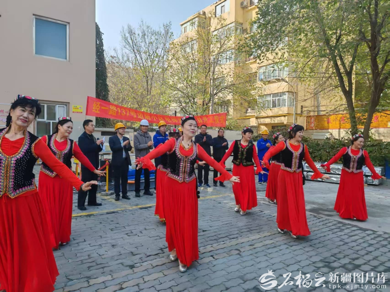 10月21日,在乌鲁木齐市经一路137号边防小区电梯更新工程开工仪式上,居民载歌载舞表达欢乐心情。石榴云/新疆日报记者魏红萍摄