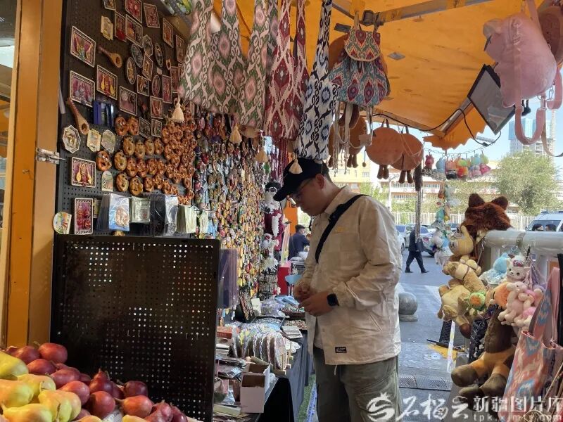 9月26日,乌鲁木齐市沙依巴克区和田二街,游客在选购文创产品。石榴云/新疆日报记者索蓉芝摄