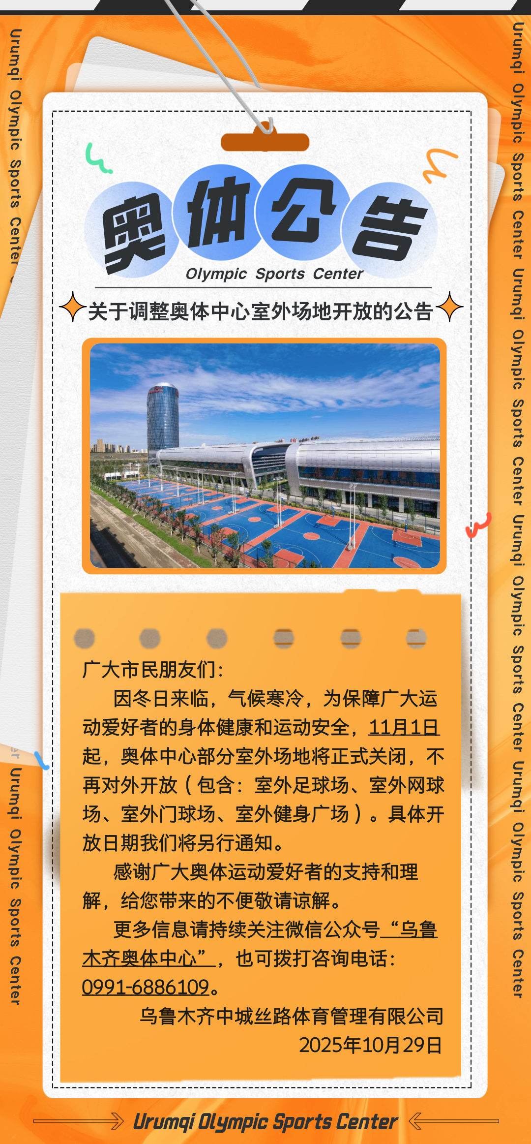 【沙依巴克·关注】11月1日起,奥体中心部分室外场地将关闭