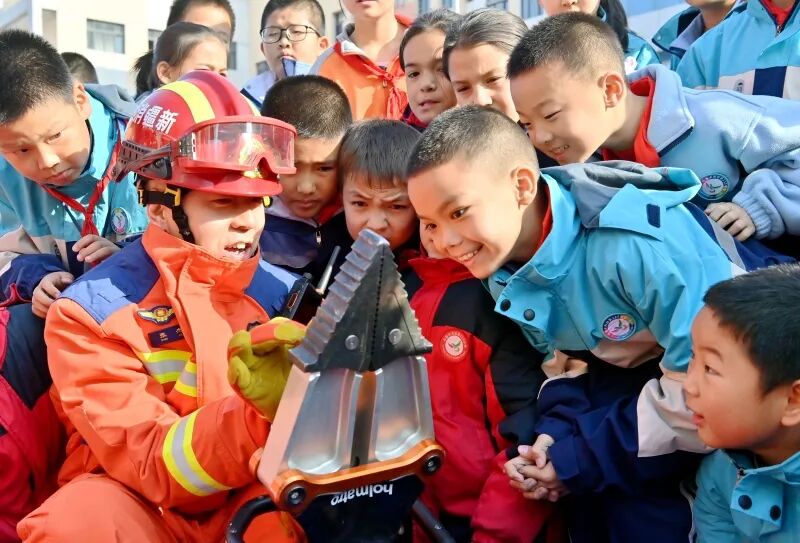 10月31日,消防救援员向同学们展示消防救援器材。石榴云/新疆法治报记者单坤摄