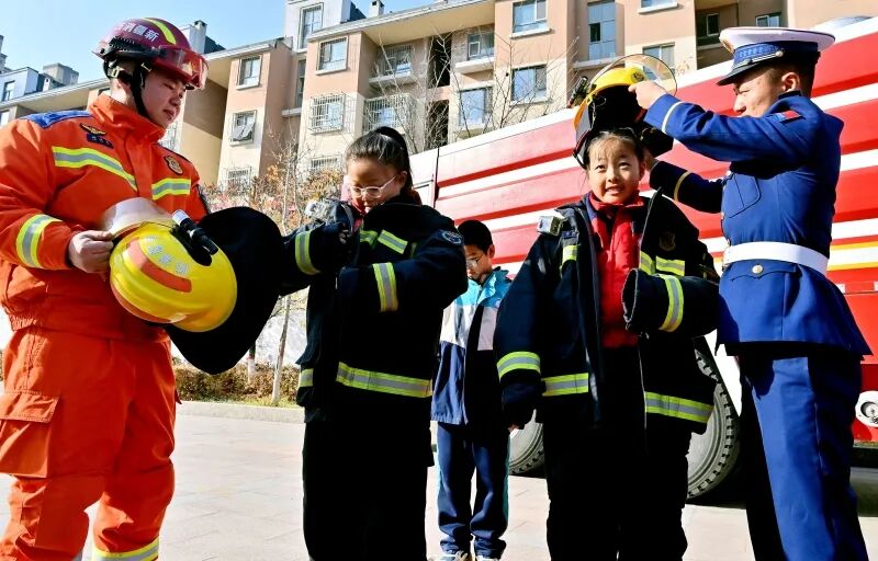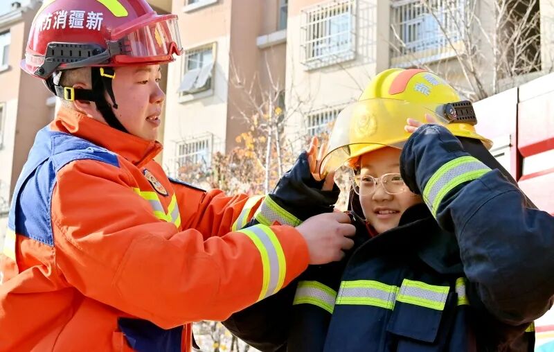 10月31日,在消防救援员的指导下,同学们穿上战斗服,亲身体验“消防员”职业。石榴云/新疆法治报记者单坤摄