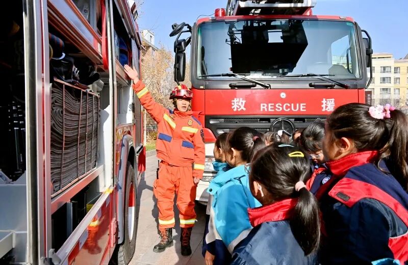 10月31日,消防救援员向同学们介绍消防车上的工具。石榴云/新疆法治报记者单坤摄