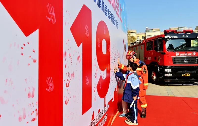10月31日,消防救援员带领同学们在“119”数字图案上按下手印。石榴云/新疆法治报记者单坤摄