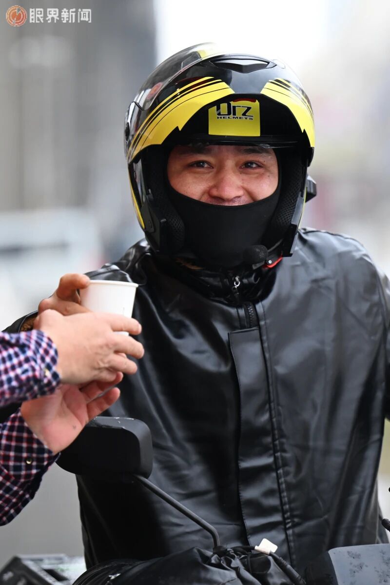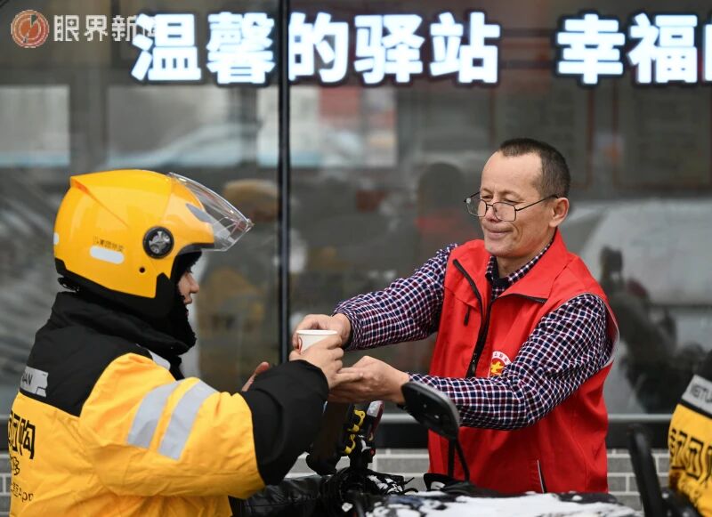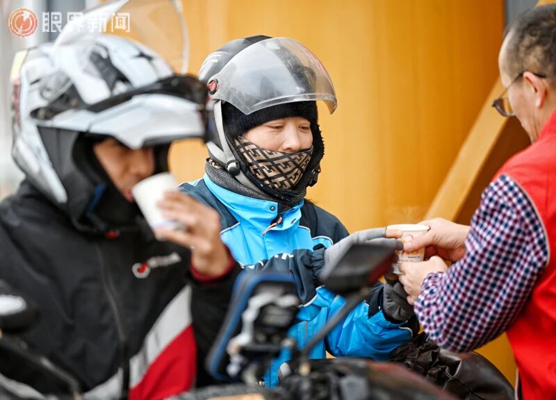 12月9日,在沙依巴克区平顶山街道平顶山社区工会驿站,工作人员为外卖骑手送去暖心姜茶。记者迪丽娜尔·加力肯摄