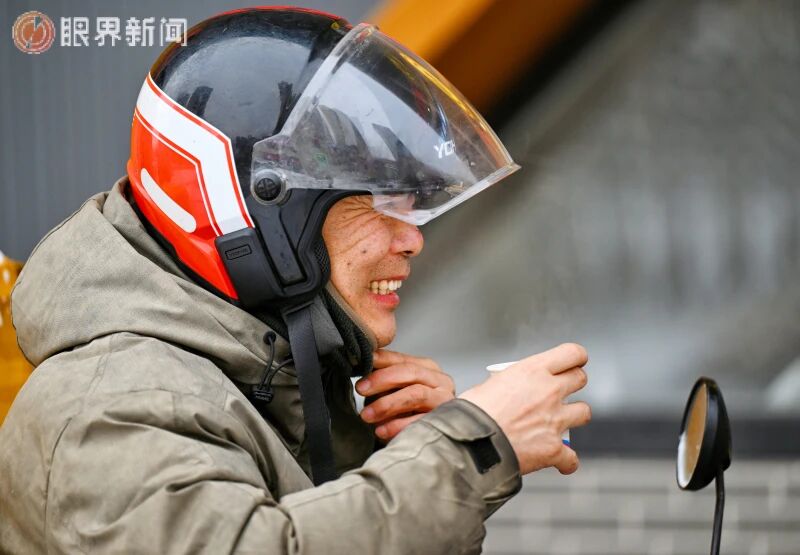 12月9日,在沙依巴克区平顶山街道平顶山社区工会驿站,一名外卖骑手喝上热气腾腾的姜茶。记者迪丽娜尔·加力肯摄