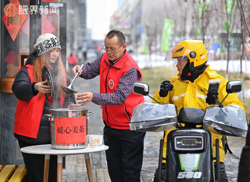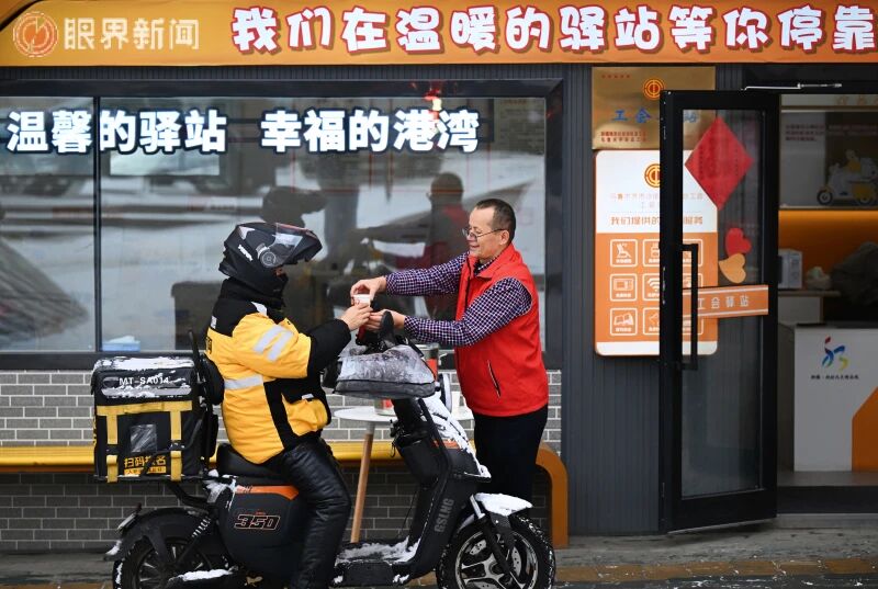12月9日,乌鲁木齐迎来降温降雪天气,沙依巴克区平顶山街道平顶山社区积极行动,为环卫工人、快递员、外卖骑手等户外工作者送去热气腾腾的姜茶,让他们在寒冷天感受到浓浓暖意。12月9日,在沙依巴克区平顶山街道平顶山社区工会驿站,工作人员为外卖骑手送去暖心姜茶。记者迪丽娜尔·加力肯摄