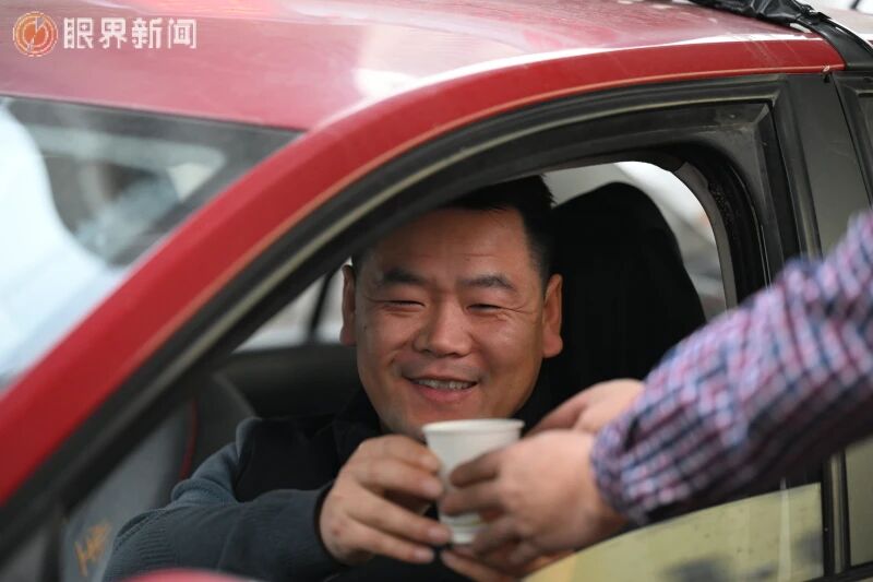 12月9日,在沙依巴克区平顶山街道平顶山社区工会驿站,出租车司机收到了暖心姜茶。记者迪丽娜尔·加力肯摄