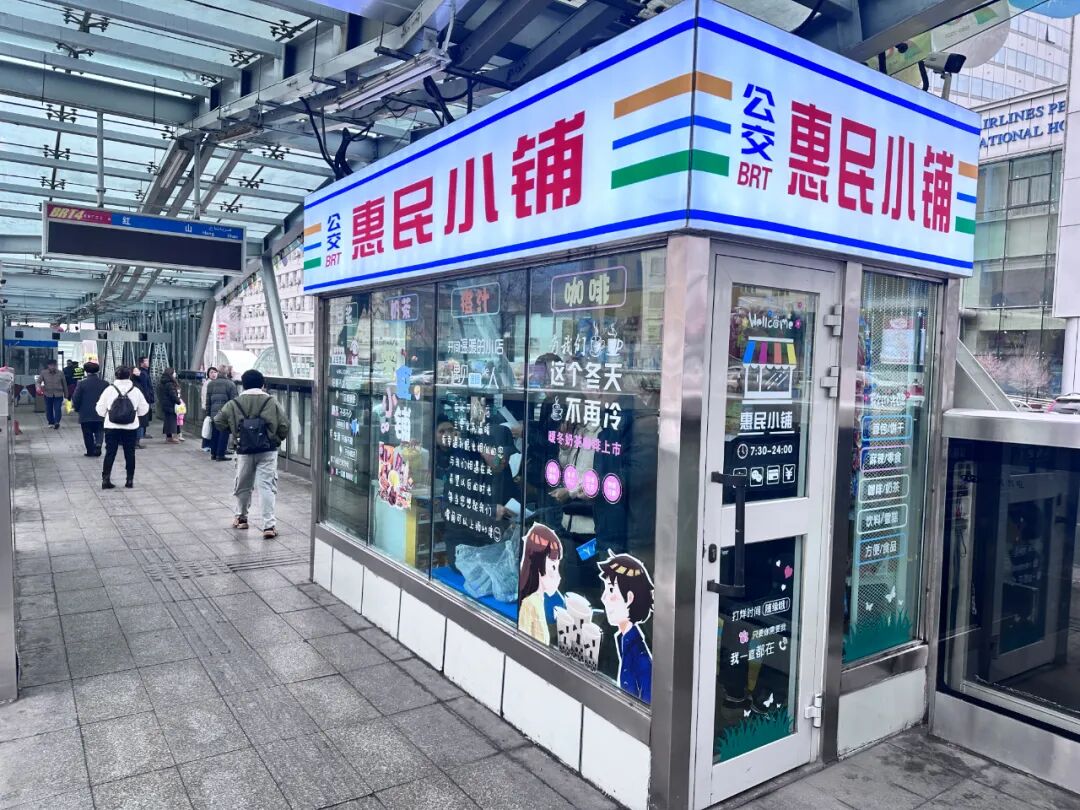 走进BRT红山站点,一间玻璃暖房打造的"惠民小铺"格外醒目。货架上,矿泉水、果汁、包装面包、独立包装饼干等商品一应俱全,柜台旁的咖啡机香气四溢,不少乘客正趁着候车间隙选购。"每天赶BRT上班,现在在站点就能买到热咖啡和面包,省时又暖胃。"市民姜悦说。