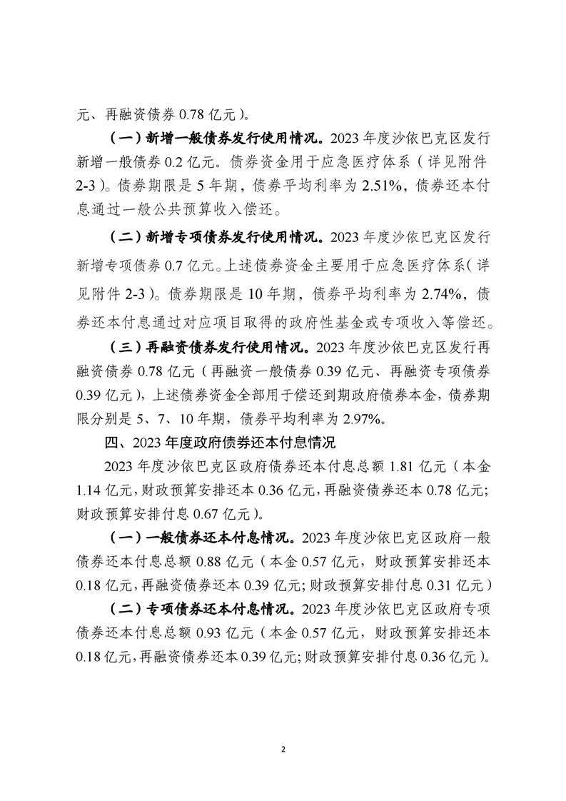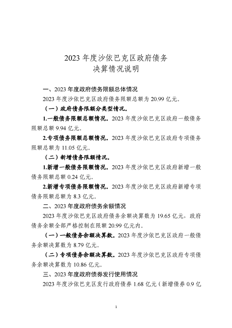 1. 2023年度沙依巴克区政府债务决算情况说明