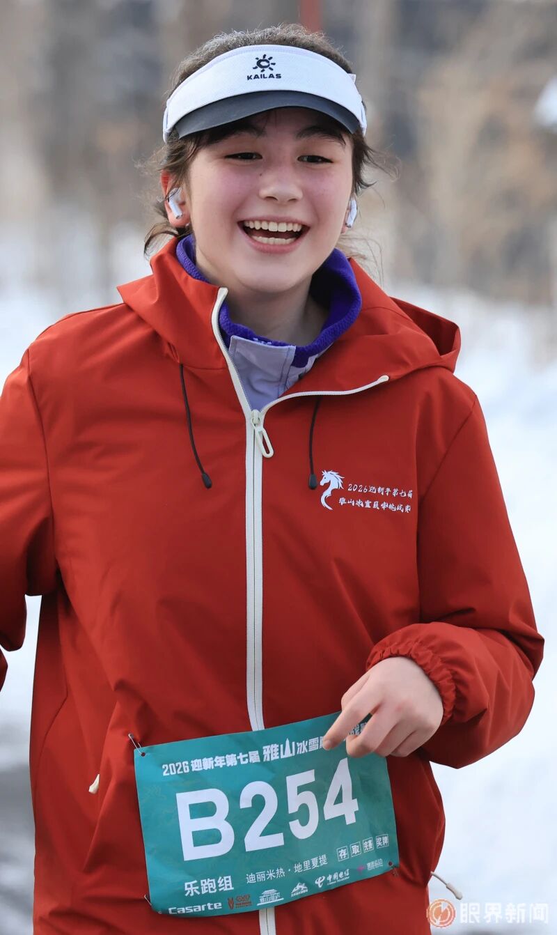 2月1日,沙依巴克区2026迎新年第七届雅山冰雪巅峰挑战赛,乐跑组的选手许梦欢稳步向前奔跑,她的笑容传递出冰雪运动带来的快乐与活力。记者迪丽娜尔·加力肯摄