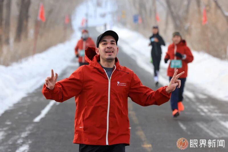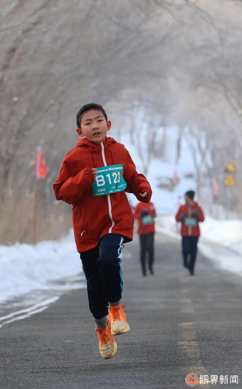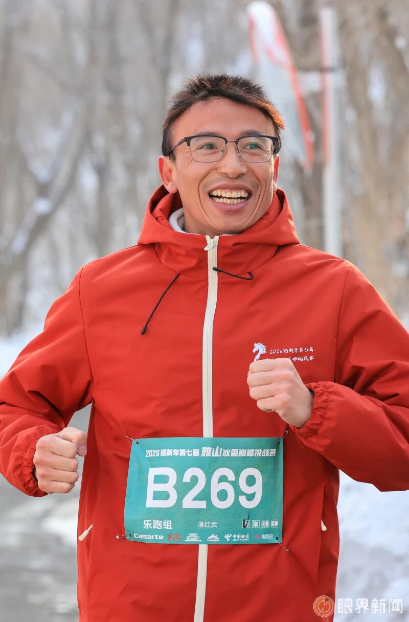 2月1日,沙依巴克区2026迎新年第七届雅山冰雪巅峰挑战赛,乐跑组的选手薄红武快乐奔跑。记者迪丽娜尔·加力肯摄