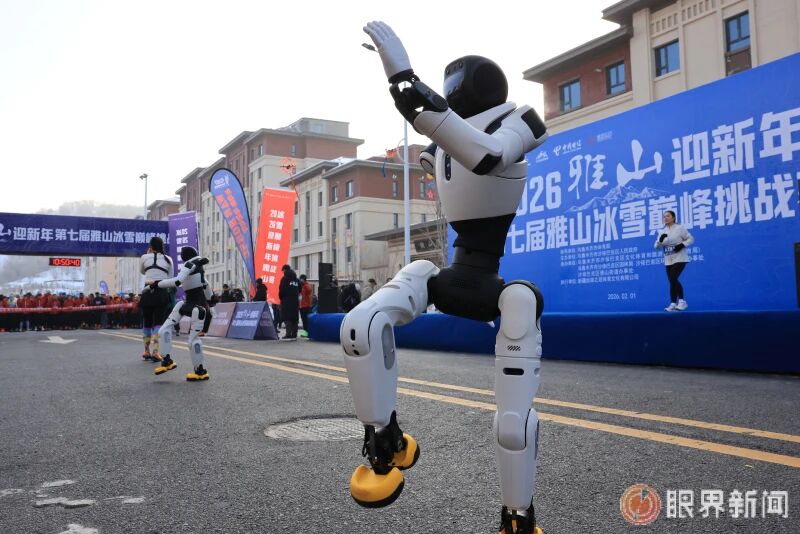 2月1日,沙依巴克区2026迎新年第七届雅山冰雪巅峰挑战赛,机器人化身热身教练,和选手们一起热身。记者迪丽娜尔·加力肯摄