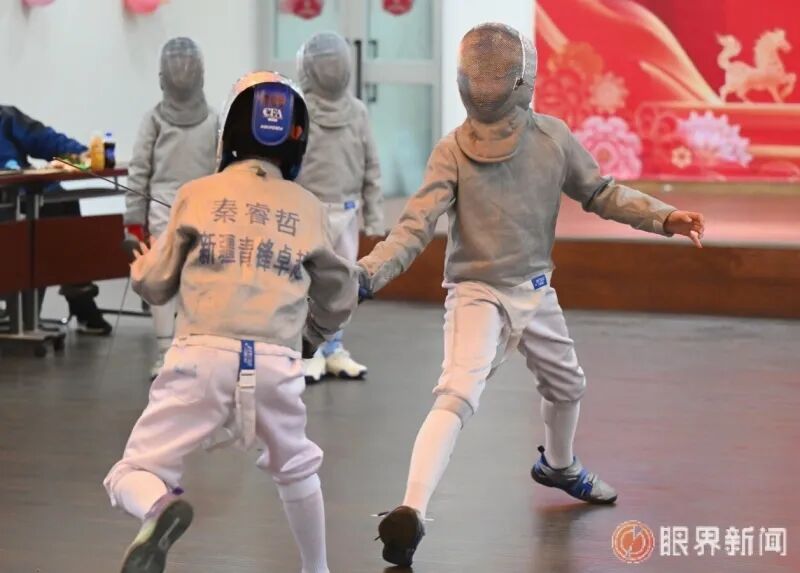 2月5日,沙依巴克区扬子江路街道黑龙江路社区,新疆青锋卓越击剑俱乐部的小朋友击剑表演《剑舞飞扬——少年剑客》。记者迪丽娜尔·加力肯摄