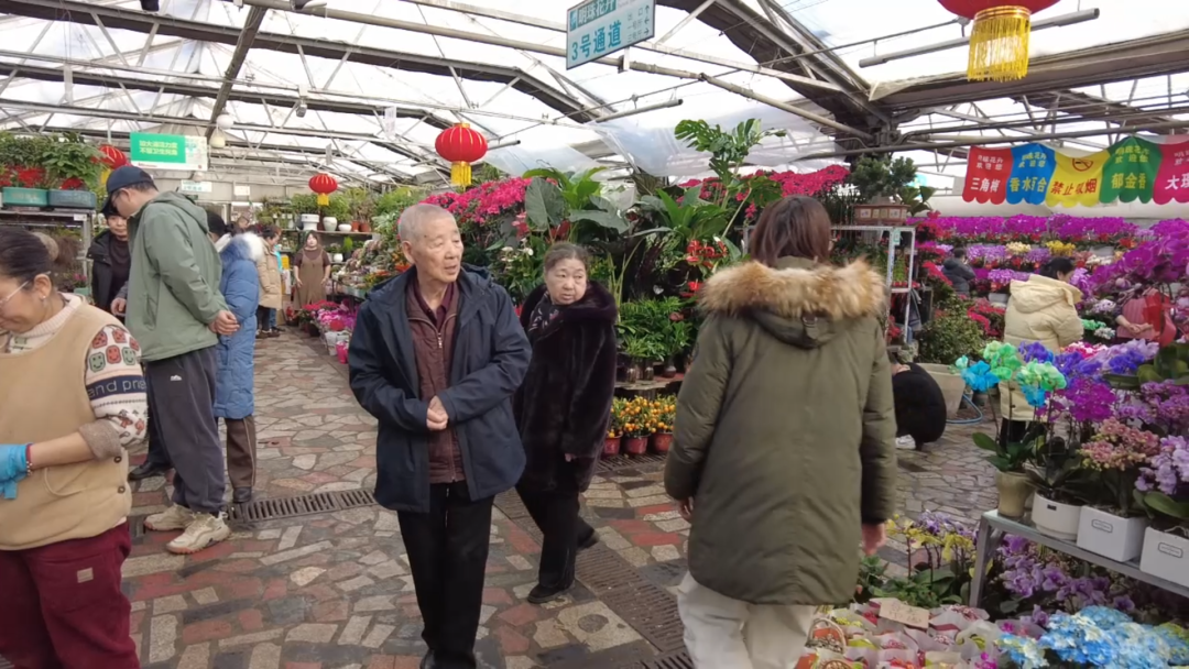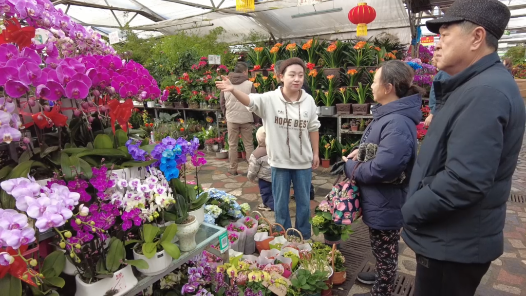 商户金秀说:“像蝴蝶兰比较畅销受欢迎,花色多、花期也长,比如经典的紫红色看起来非常喜庆,其他像杜鹃、绣球、红掌等也卖得不错。我们还特意准备了一些小卡片挂在花上,增加过年氛围。”