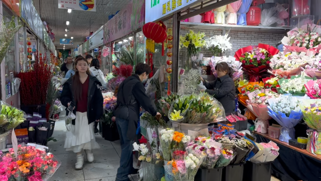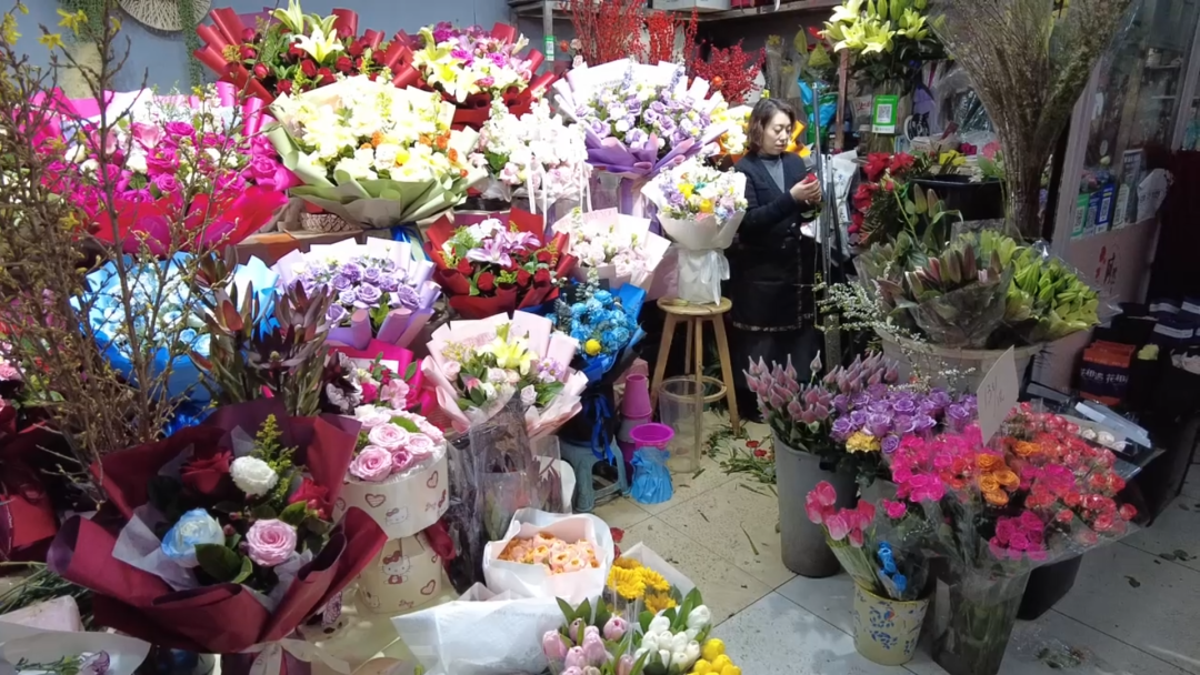 商户韩晓红说:“销量最好的还是百合和玫瑰,寓意事事顺心、美好祝福。今年除了红色系,紫色系的花束也很流行,这类喜庆的颜色更受欢迎。近期的订单比平时增加了50%到60%。”