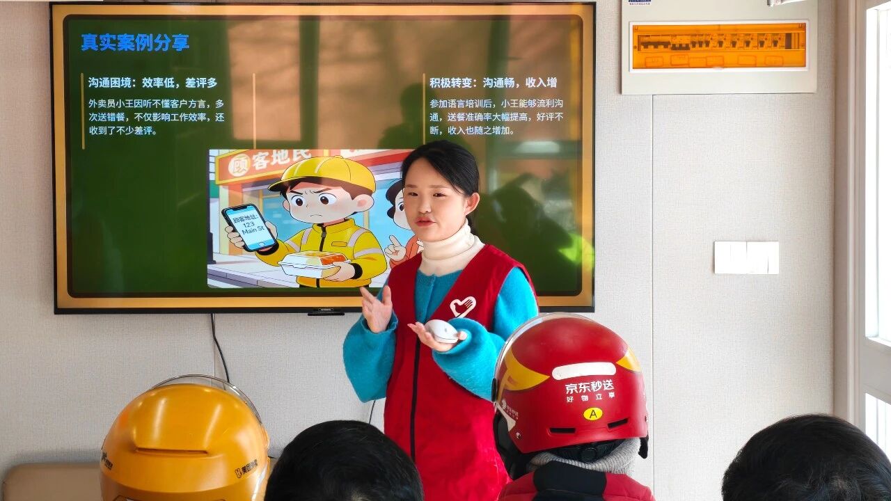 课堂上,没有枯燥的理论,只有满满的“干货”。社区工作人员和志愿者们把大家日常工作中的高频场景,如接单对话、地址确认、取送件沟通、礼貌问候等,设计成生动的情景模拟。从教大家准确念出复杂的路名,到练习一句清晰的“您好,外卖已到楼下”;从纠正一个可能引发误会的地方口音,到教会一句温暖的“请慢用”——每一个细节,都精准瞄准了小哥们工作中的“痛点”。