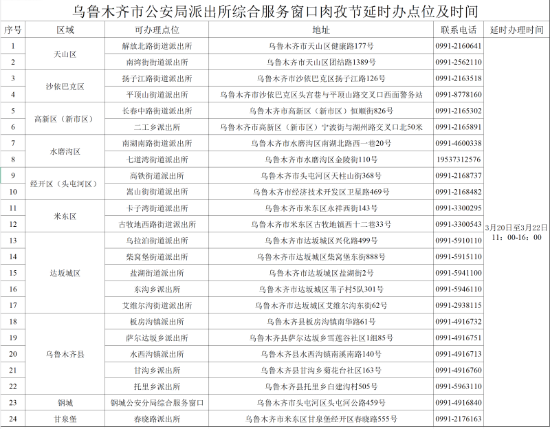 乌鲁木齐市公安局派出所综合服务窗口肉孜节延时办点位及时间