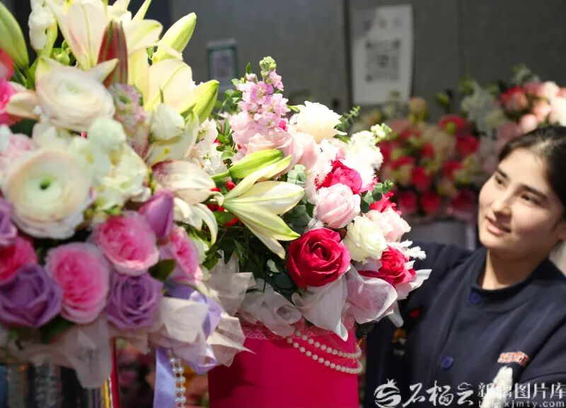 3月9日,在乌鲁木齐市明珠花卉市场,一商户在整理花束。