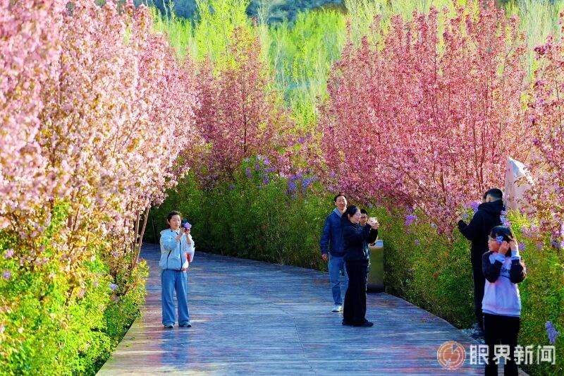 4月18日,乌鲁木齐市沙依巴克区雅玛里克山森林公园,市民和游客漫步在花海步道间拍照留念定格春日盛景,享受这座城市的浪漫春光。记者陈岩摄