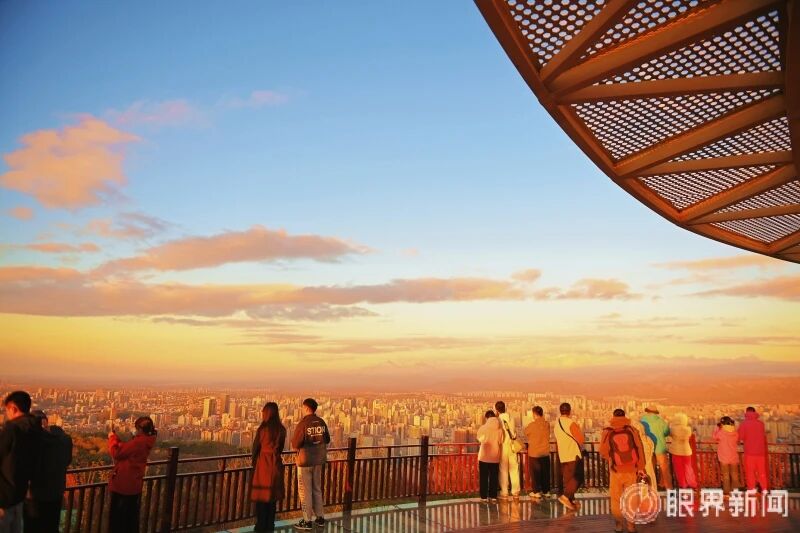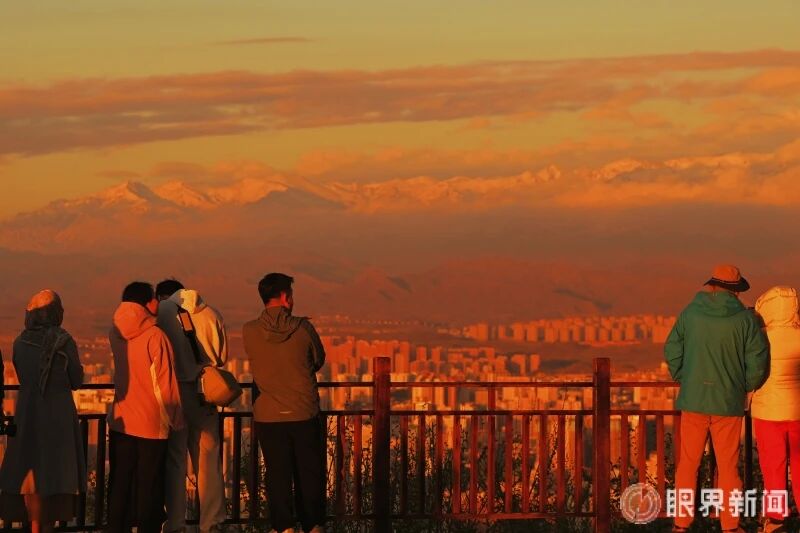 4月18日,在乌鲁木齐市沙依巴克区雅玛里克山森林公园云满台观景台,市民与游客凭栏远眺,在落日熔金的霞光中俯瞰整座城市,远处博格达雪峰的轮廓在暮色中若隐若现。落日、城景与雪峰同框,勾勒出乌鲁木齐春日最治愈的天际线。记者陈岩摄