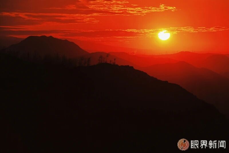 4月18日,乌鲁木齐市沙依巴克区雅玛里克山森林公园,一轮落日将天际晕染成浓烈的橙红色,云霞如焰、层峦如黛,在雅山之巅铺展出一幅极具张力的春日落日画卷。记者陈岩摄
