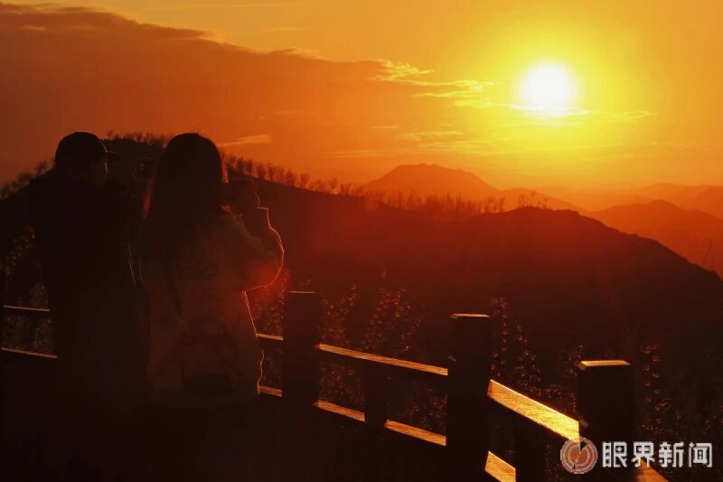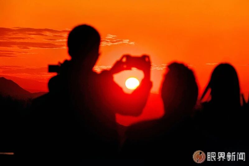 4月18日,乌鲁木齐市沙依巴克区雅玛里克山森林公园云满台观景台,市民与游客在观景台用镜头定格落日熔金的浪漫时刻,红色霞光将山峦与天空晕染成一幅治愈的春日画卷。记者陈岩摄