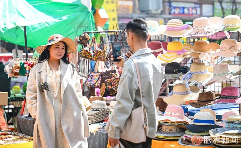 4月4日,清明小长假首日,大巴扎景区、和田二街等特色街区迎来各地游客。游客们漫步在街区,挑选心仪的商品、或品尝特色美食、或打卡拍照,感受街区独特魅力,度过惬意假期。图为4月4日,在和田二街,来自西安的游客在选购遮阳帽。记者米热扎提·木塔力甫摄