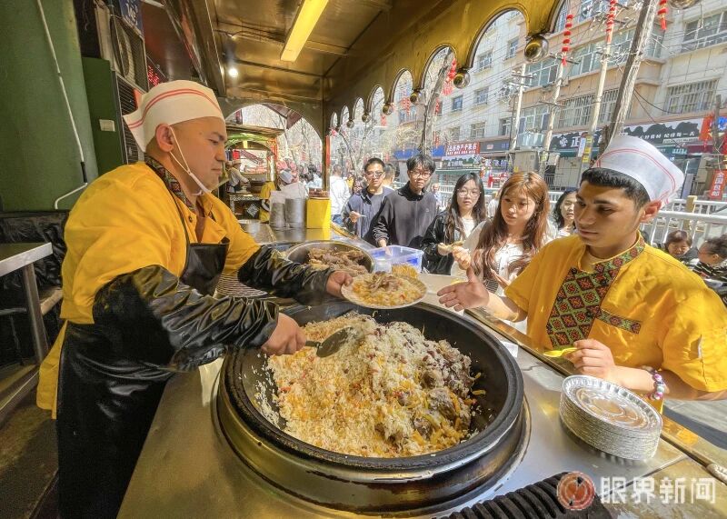 4月4日,在和田二街,游客排队购买抓饭。记者米热扎提·木塔力甫摄