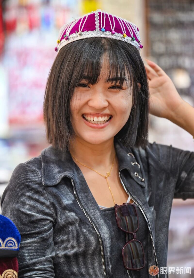 4月4日,在大巴扎景区,一名来自内蒙古的游客试戴花帽。记者米热扎提·木塔力甫摄