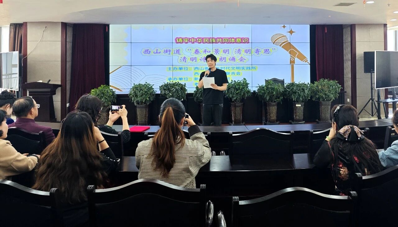 西山街道新时代文明实践所联合多部门举办“春和景明清明寄思”诗词朗诵会,辖区居民、文艺爱好者、退役军人代表以诗为媒、以声传情,在经典诵读中抒发家国情怀。